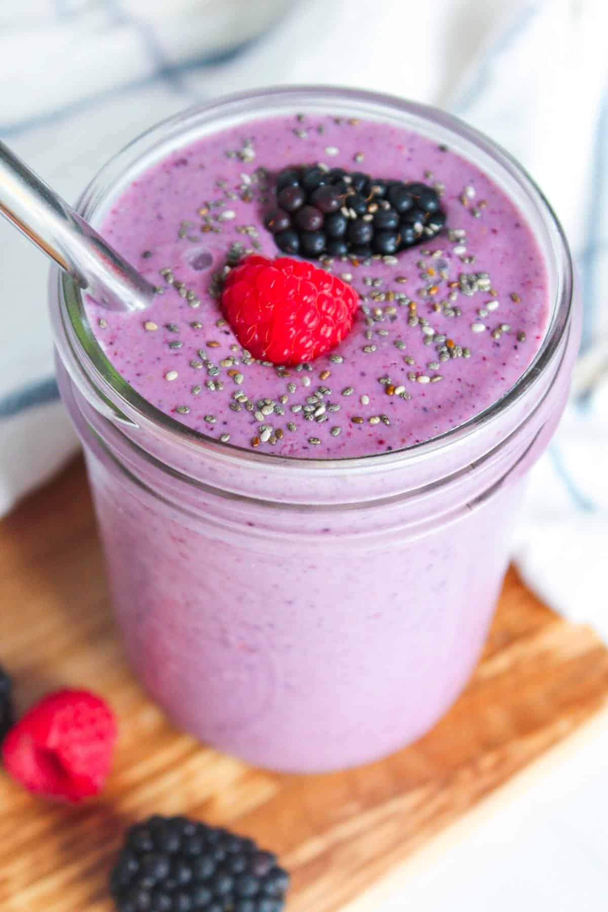 Making a smoothie is one of the easiest ways to increase your fiber intake. The fruit base here is mixed frozen berries with banana for texture, and the oats and chia seeds add a great blend of additional fiber and omega-3s. And, greek yogurt rounds us out here with protein.